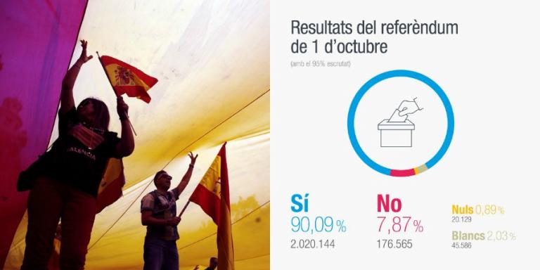 - Στη δημοσιότητα τα πρώτα αποτελέσματα για το δημοψήφισμα στην Καταλονία - Συντριπτική νίκη του "ναι" - Σύμφωνα με αυτά, το 90% όσων ψήφισαν, τάχθηκαν υπέρ της ανεξαρτησίας της Καταλονίας - Η συμμετοχή άγγιξε το 42,3% του συνόλου των ψηφοφόρων στην Καταλονία, παρά τα ισχυρά μέτρα της αστυνομίας αλλά και τα βίαια επεισόδια - Τουλάχιστον 844 άνθρωποι τραυματίστηκαν στην