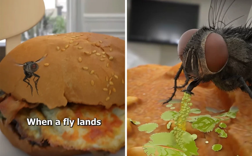 «Οι μύγες δεν μπορούν στην πραγματικότητα να μασήσουν όπως οι άνθρωποι, οπότε αντί γι’ αυτό ξερνούν -κατά κάποιο τρόπο- έναν ειδικό τύπο σάλιου ακριβώς πάνω στο γεύμα σας», εξηγεί το βίντεο.