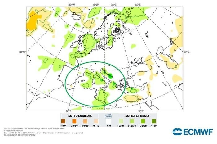 Για την Ιταλία και συνολικά τον μεσογειακό χώρο, η προοπτική φέρνει μαζί της κινδύνους. Τα μοντέλα προβλέπουν υπερβάλλουσες βροχοπτώσεις το φθινόπωρο και τον χειμώνα, με συχνά κύματα κακοκαιρίας. Αυτό σημαίνει αυξημένη πιθανότητα για έντονες καταιγίδες, πλημμυρικά επεισόδια και –στις πιο ακραίες περιπτώσεις– ταχύτατες «flash floods».