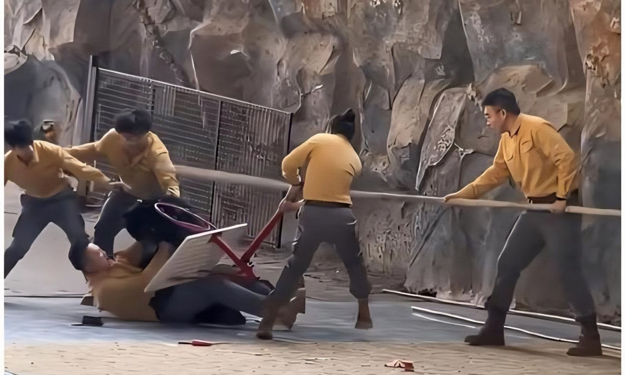 υπάλληλο του ζωολογικού κήπου, ακινητοποιώντας τον στο έδαφος, ενώ αυτός προσπαθεί μάταια να σηκωθεί. Το πλήθος, ανάμεσά τους και μικρά παιδιά παρακολουθεί με τρόμο, υπό τους ήχους δυνατής μουσικής.Άμεσα συνάδερφοί του σπεύδουν να βοηθήσουν χρησιμοποιώντας ένα καλάθι μπάσκετ, μια καρέκλα και ένα μπαμπού για να απωθήσουν το ζώο, το οποίο είχε εξιτάρει μια μεγάλη τσάντα με καρότα και μήλα που κουβαλούσε ο εκπαιδευτής του.