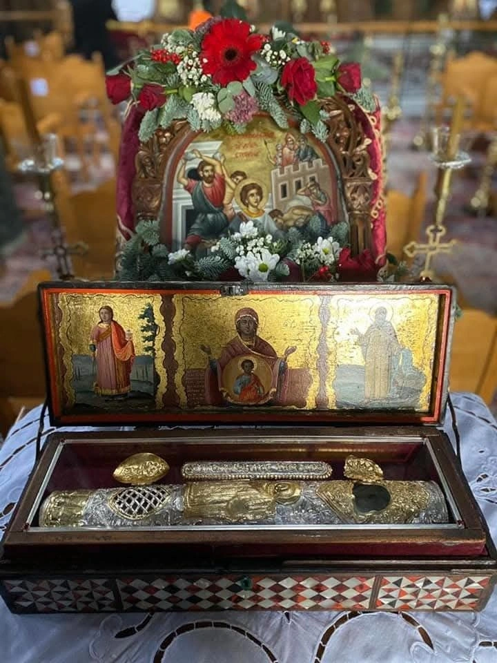 Το άφθαρτο αυτό Ιερό Λείψανο του Αγίου (δεξιά κνήμη) μεταφέρθηκε από την Σαφράμπολη της Παφλαγονίας και φυλάσσεται ως πολύτιμο θησαύρισμα εντός του Ναού.