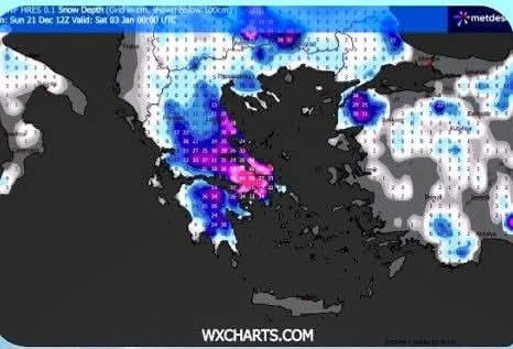 Ένα τρέξιμο του Ευρωπαϊκού μοντέλου ECMWF που το πιθανότερο φυσικά είναι να παραμείνει στο αρχείο καθώς εκτός ότι δείχνει πανελλαδικό χιονιά μέχρι και τις 3 Ιανουαρίου, το πιο ακραίο σημείο του χάρτη είναι η ποσότητα χιονιού που φαίνεται να πέφτει στην