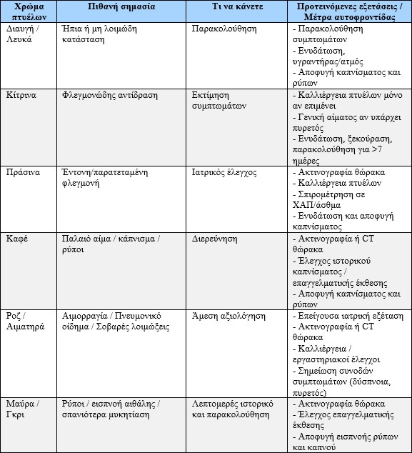 Πίνακας: Χρώμα πτυέλων και κλινική καθοδήγηση