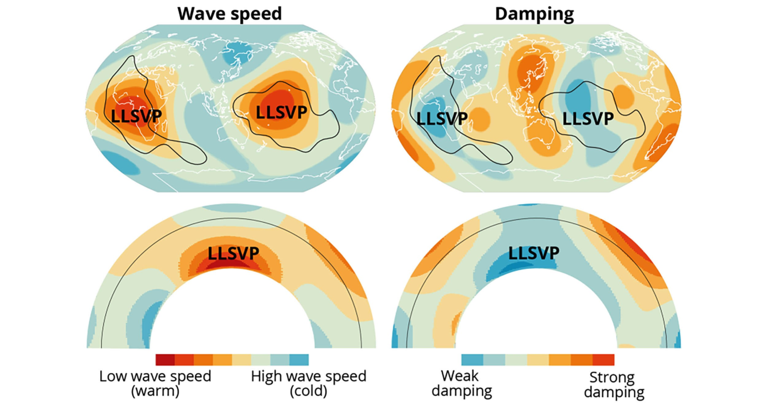 Τοποθεσία των LLSVP και σχηματική αναπαράσταση της διατομής της Γης για την ταχύτητα και την απόσβεση των σεισμικών κυμάτων. Πηγή: Πανεπιστήμιο της Ουτρέχτης